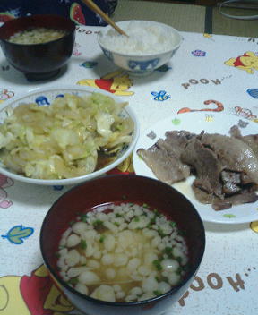 こんにちは(^^)/~~~遅くなりましたが昨日の晩ご飯を紹介したいと思います。初めて載せるので気付いたことは、どしどしコメントを寄せて下さ~い。この雪の影響で野菜も高く値上がり昨日はあり合わせの材料で作りました。[野菜炒め] キャベツとタマネギを切り塩・コショウをふり 味はオイスタ-スで最後に七味をふりかけてみました。 [牛肉焼き] フライパンで普通に焼き食べるときにモランボンの ジャンでからめて食べました。[お味噌汁] 沸騰したら味の素と本だしを入れお味噌をいれました。 具はミョウガをいれました。 ミョウガは千切りにし、水洗いをします。 食べる時に揚げ玉を入れると美味しいです。うちはいつもこれを使ってま~す。天ぷらも出来、揚げ玉も出来、 一石二鳥ですよ!!是非、試してご賞味下さ~いコメントお待ちしています。(^_^)/~