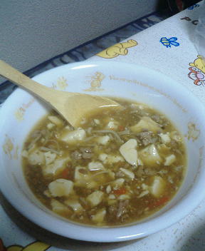 昨夜は麻婆豆腐を作っちゃいました。(^∀^*)ノ゙が、しかし店で売っているようにはいつもいかないんです。豆腐をグチャグチャになっちゃうし、片栗粉を多めに入れてるのですが、最初に食べている時は水っぽくなってしまうし・・・・。(ノ_