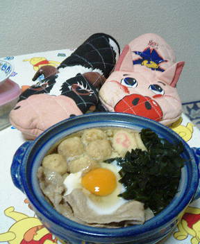 ★1月12日 晩ご飯♪鍋焼きうどん[具材] ☆ダシをつくる。 沸騰したお湯にお酒・味の素・本だし・醤油・白だし で、味をつくる。 (白だしは石川県の実家から送られたもの) ☆肉は前の日に余った豚肉を塩・コショウで焼き、 肉だんごとなるとを同じフライパンに入れ、 ダシを少し入れ汁がなくなるまで煮立てる。 (味がついて美味しい) ☆一人用の鍋にダシを入れ冷凍うどんを入れ、 沸騰したらフライパンで炒めた肉とだんごとなるとを 入れ、わかめと卵を入れたら火を止めフタをし、 少しまったら出来上がり!!簡単で美味しいよ!!(^_^)/一度ご賞味下さい。 ◎料理酒じゃなくても普通の日本酒で代用しても、美味しいです。◎何にでも使えます。◎ダシを作る時は簡単で便利です。◎ウチでは普通使うのは減塩でこの濃い口醤油は、ダシを作る時とか煮物を作る時に使うと良いです。◎減塩は普通の醤油と比べ塩が少ないけど、そんなにかわりません。健康の為に一度使ってみては・・・。◎石川県では使うそうです。美味しいですよ!!◎香川の讃岐うどんはコシがあり美味しいです。冷凍にしたら日持ちもして使いやすくて便利です。今日はダシを作る広告を掲載しました。コメントお待ちしてま~す(^_^)/~