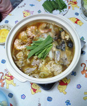 昨日は久々に買い出しに行きました。前の日は大雨で出かけられず少し失敗したカレ-うどんを夫は美味しく食べて頂いたので昨日(15日)は名誉ばんかいの意味も兼ね、夫の大好きな鍋をしてあげたく買い出しに・・・。ところが、野菜が高くネギなんて買えなかった。【キムチ鍋】 ☆白菜・椎茸・冷凍えび・真だらのアラと白子・ 結んだ白滝・バラ肉・鶏肉・ニラです。 ☆辛みが足らない方はキムチの素をいれても OKです。辛いのが食べれる方はおすすめです!! ◎土鍋なんて格安ですよ!!ぜひ、一度ご賞味下さい。コメントお待ちしています。