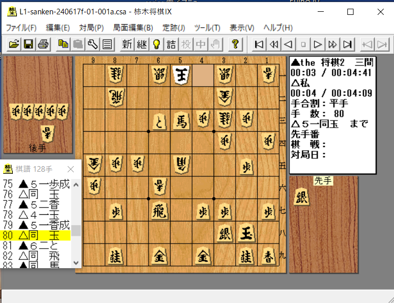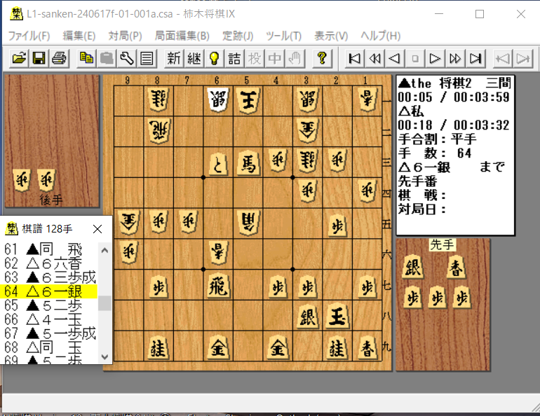 ▲5三桂右成△3七馬 まで128手で後手の私の勝ち。