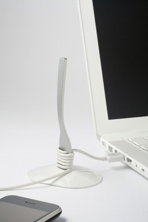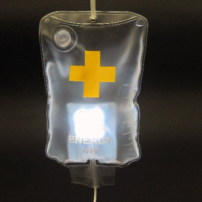 上からぶら下げるLEDの間接照明です。薬液の代わりに水等を入れて使用します。赤い液体を入れるとまるで輸血しているよう。点滴チューブの代わりにUSBケーブル、その先にはLEDのオン・オフスイッチ。袋の中にあるLEDの灯りはぼんやりと明るく怪しげな光を放ちます。