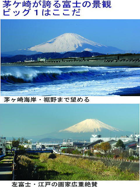 今日の富士山は最高でした。 熱血カメラマンさんからいただいた写真です。 茅ヶ崎からの富士山で一番すばらしいのは なんといってもサザンビーチからの富士山 裾野までの全体が見えるんです。 また、国道1号線、浜見平入り口鳥井戸橋からの左富士も絶景です。遠近法の関係でドドンと大きく見えるのは 若松町の湘南信用金庫前から・・・すぐに見えなくなりますが 小出川沿い宮田工業から<竜泉寺の湯>に向かう道も。 探せばいくらでもあるんでしょうが