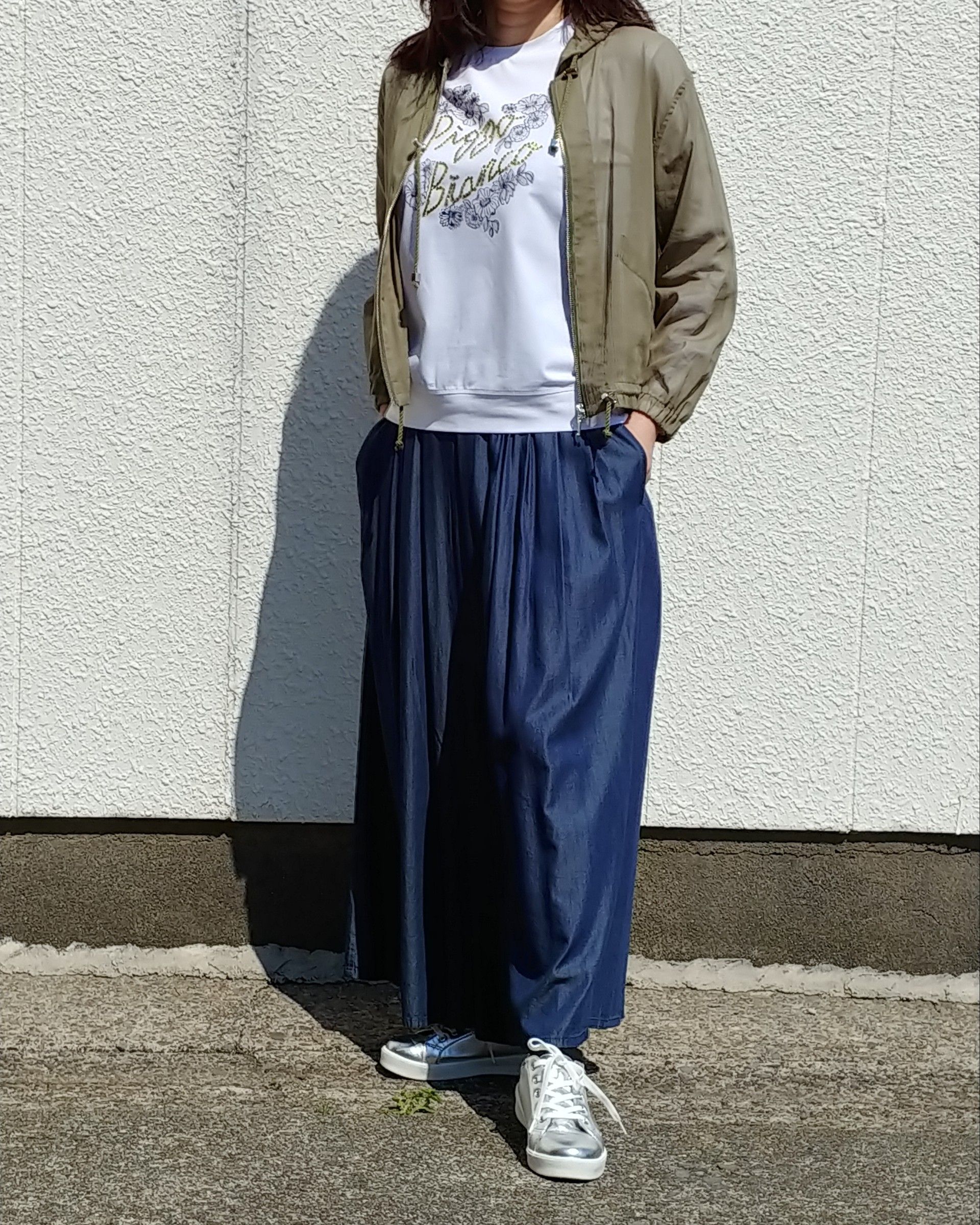 えちゴンぬりえに関してはこちらこんにちは😃今日は良いお天気でしたね〜✨✨お店で商品出しなどでバタバタ動くと、少し汗ばむ感じでした💦夏が近づいていますね(^o^)今日はすぐに使える着回しコーデをご紹介させていただきますね💕トップス ロゴ長袖Tシャッ pizzo bianco ¥15,500+税 ホワイト、グリーンブルゾン フード付きパーカーpizzo bianco ¥18,500+税ロゴ長袖Tシャツは、綿、ポリ素材です。適度な身幅ですのでとっても着心地が良いです👍合わせたブルゾンは、綿100%です❗️着たけが長すぎないので、サッと羽織れますね。パンツやスカートなど色々なアイテムに合わせて使える商品ですね😍パンツ JIUNO ¥16,800+税柔らかいデニム風生地のスカートタイプのパンツです‼️ウエストはリブタイプのゴム仕様で、膝下辺りから割れてます…ハカマみたいです。。😳…ちょっとだけ変わっているのですが、履き心地抜群でテンセル素材ですので、広がりが無いです👍トップス cocora¥14,800+税パンツ pizzo bianco15,800+税胸元にミシンのアップリケが付いているトレーナーです💕お尻が、すっぽり隠れてしまう着丈ですので、細身のパンツと合わせても良いですね👍パンツは、ストレッチが効いている商品で、よーく見るとストライプ柄です。後ろに付いているスリットも軽さが感じられて良いですね(^ ^)パンツは、ブラウスやジャヶットなどに合わせるとキレイめにお使い出来る商品で〜す⭐️☆ラインアットでもお得な情報を発信中☆ラインアットにご登録いただければ、お問合せもとってもスムーズに☆こちらからのメッセージ配信は週に1回程度ですが、お友達限定のお得なお知らせが多数ございますので、ぜひ登録をお願いいたします!!!楽天市場店でエレガンスミュージアムの商品がご覧になれます♪お得なイベントも盛りだくさん!!楽天市場店はこちらインスタグラムもぜひご覧ください☆