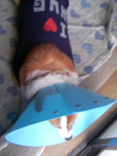 お蔭様で、無事にロビンの手術が完了して、今日家に戻ってきました!18日が入院で、19日の夜遅くに手術していただけました。先生方には、本当にお礼のしようもないほど、お世話になりました。私の手作りの手帳と便箋封筒を渡してきました(^^;喜んで頂けたので、嬉しいです!結局、ロビンの手術は、足の筋肉を少し切り取り、会陰の辺りに埋め込む移植のような形を取ったらしいです。そして、腸を飛び出さないように固定して、膀胱を元の位置に戻していただけたようです・・・オスが会陰ヘルニアになりやすいらしく、ホルモンの関係なので、去勢もした方が再発防止になるとのお話で、それもして頂きました。ですので、傷はお尻の両サイドと、お腹と3箇所縫ってます。しばらくはエリマキトカゲ状態で過ごすことになります(^^; 頑張れロビン!!何はともあれ、物凄いラッキーが重なっての今回の手術・・・・感謝感謝です。