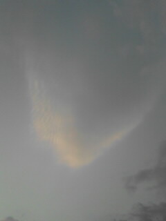 昨日の散歩の時見た雲です(^^)ツバメが飛んでるみたいでしょ~携帯カメラなので、色の出方が悪いけど(^^;実際は綺麗なピンク色でした・・・・この雲だけが明るく夕陽に照らされた感じでした。他はどんより曇ってたのです~素敵なプレゼントを頂いた気分でした