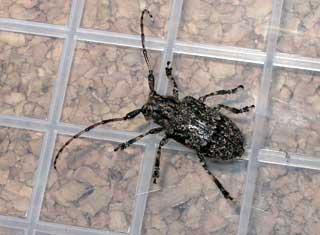 きょう、子供が1日外で遊んでいて、採ってきたもの‥。こんなものが家の近所にいたんだ‥。ゴマフカミキリのメスでしょうか???ちなみに、大きさは下のケースの格子模様が1辺1.5cmです。さっそく『カミキリ 飼育』で検索かけて何を食べるのか調べてみました。(クワカブ用のゼリーには見向きもしません。)すると、枯れ木の小枝、キュウリ、カボチャ、オロナミンCだそうです。どれも今、ウチにはないし‥(^-^;;;でも、数週間しか生きない種が多いらしい‥。
