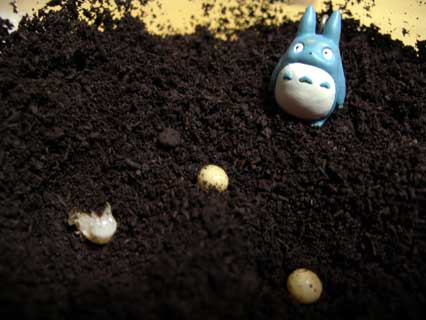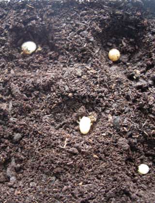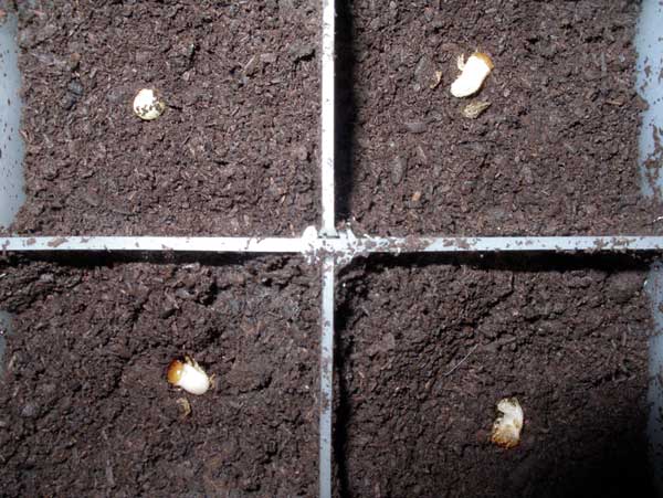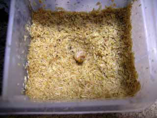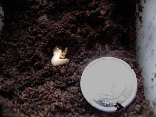 きょうは、たーちゃん++さんからいただいた幼虫、小力と力也のお引っ越しです。先週木曜日到着で、長旅の疲れもとれた頃だと思ったので、引っ越ししようと思ったわけですが、フタを開けてみると結構なフンの数。大きさが大豆くらい、いや大豆以上の大きさでした。到着時に顔を見た印象で、『もうちょっと小さくなかった^-^?』と思っていたんですが、出てきてもらうとどちらも体の直径が1cmくらいあって、頭は2令なのでまだ小さいんですけど、体は大きくなってて、小さめの国産カブトならそのまま蛹になってもおかしくない大きさでした(^-^;また次回には大きい部屋に引っ越さないといけないかもしれませんが、とりあえずDVDスピンドルケース改に入ってもらいました。今までの2倍くらいの広さになりました。これまでのマットとウチのマットは種類が違うので、まずいただいた容器に入っていたものをフルイにかけ、フンを取り除きました。フンを取り除いたマットに小力と力也を入れておき、フルイに残ったフンを潰して細かくし、そこに『きのこの山』ビートルマットを加えてかき混ぜてから小力と力也が潜ったマットの上に盛りました。これで食べてくれるといいんですけど‥。ところで、容器を開けた時に、ずっと以前から思っていた疑問が再燃しました。『フンはなぜマットの表面に集まるの?』マットの上に出てきてフンをしているとは思えないんですが、幼虫が動いているうちに液状化現象みたいにフンが湧き出てくるんでしょうか(^-^)???