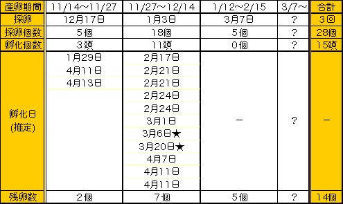 昨晩、なんとなく気になってまたエレファスの卵ケースを見てみると、第1回採卵分の残り3個のうち1個が孵化していましたそろそろわからなくなってきたので、現在までの孵化状況を表にまとめてみました。記録期間 2005年11月~2006年4月13日今回の卵が卵期間最長となります。こうやって整理してみると、もう産卵してから5か月近くなるんですね‥。孵化した卵15個のうち、★1、“たぶん★”1なので、孵化成功13個はまだ孵化成功率が50%いってません。【“たぶん★”やはりダメでした。4月14日★確認‥】あと14個、どこまで孵化してくれるかな‥。