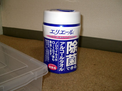 ウチでは菌糸を詰めるために菌糸ビンを消毒するという作業はありません。菌糸ビン飼育をするような主がほとんどいませんので。ただ、マット換えの時には必ずケースを除菌してからマットを詰めるようにしています。それに使っているのが、これです80枚入りで500円近くしますので、何でもかんでも拭けるというものではありません。でも、マット換えの時には必ずケースをこれで拭くんです。ノロウイルスも0-157も除菌できるんなら、ケースの雑菌は全部やっつけてくれるだろうという期待をしています。拭くだけで簡単に済ませてしまえるこれがお気に入りなんです(^-^)