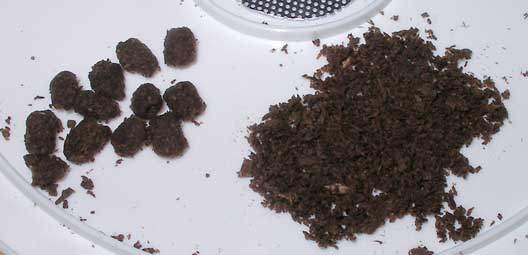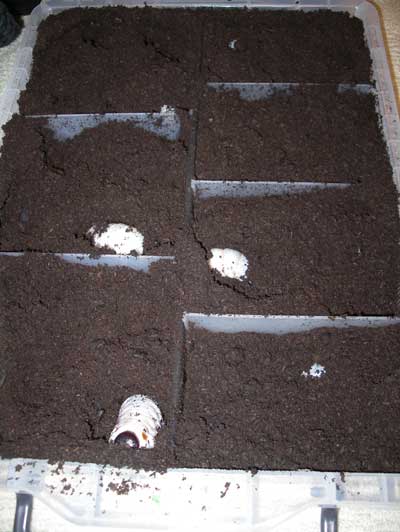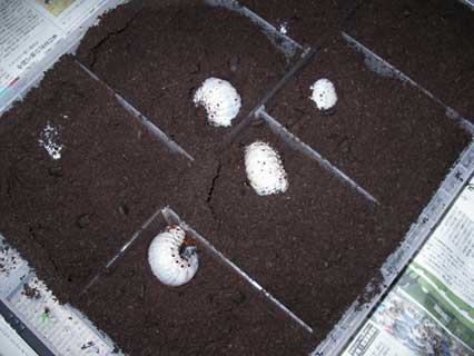 ケースに移したのが4日(日)。6日(火)夜にチェックして何事もなし。そして今日9日(金)夜‥。先ほどの日記の通り、初2令24頭まとめがいのケースで異常にマットが減っている枠があったのです。そしてその枠のマットを全部出してみると‥、やはり幼虫は枠内にいませんでした‥。ケースの外に逃げることは不可能。となれば、フタと仕切りの隙間を、仕切りを乗り越えて移動したに違いありません。まだ小さい幼虫ですからスペース的には全くあり得る話です。そこで、底からチェッッッック!やっぱりです!!!!ここだぁ!!大きいのが4月11日孵化の脱走君。小さいのが4月29日孵化の幼虫です。狭いところに2頭、さぞかし、窮屈だったでしょう(^◇^)(1枠の大きさは、9cm角くらいです。)しかも‥‥‥、隣じゃなくて2つ先でした(^◇^;しかし、今回の脱走劇は、わずか5日でエサが不足してしまったことを意味します。試しにフンが多そうな枠を選んでフンの数をかぞえてみると‥‥‥、250個超えてます!‥‥(@◇@;;;マット換えから丸5日間ですから、毎日50個以上のフンをし続けたことになりますね。これがエレファスたち大型カブトの飼育で、マットがフンに化けるイリュージョンの実体でした。。。