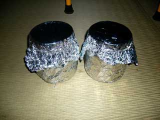 まだ投入してから19日しか経っていないニジイロ幼虫2頭の菌糸ビンですが、最近室温が30度を越えることが多いので、カビなんかが出ていないか、チェックしてみました。普段は、こんな感じで遮光しています。暗い部屋で、アルミホイルを外してみると、ちゃんと暴れずに食べてくれているようです。しかし、大きさが‥。たーちゃん++さんからいただいた時には3頭とも同じくらいの大きさだったはずなんですが、大きさが2倍くらい違っています実は、左の大きいのが、最初から菌糸ビンに入れていた1頭。右は最初に1か月くらいマットで過ごさせた1頭です。(残る1頭は今でもマットの中ですが、マットに菌糸カス、産卵木を入れて、好きなの食べて!とやっているんですが、今日見たらケース底のマットにいました^-^;)やっぱりニジイロは最初から菌糸ビンでいったほうが大きくなるんでしょうか