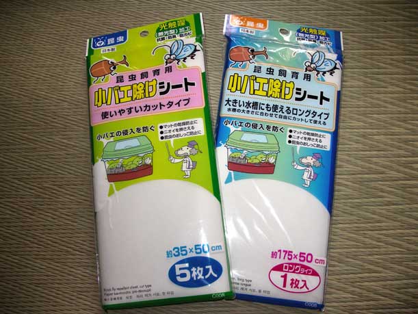 ウチの親が、100円ショップにこんなものがあったよ!と買ってきたのが、コバエやカビを極端に嫌がるウチの親らしい選択なんですが、良くみると品質、大きさ、値段、どれをとっても満足がいくものでした。一方は大きいシート1枚、一方はそれを最初から5等分してあるもの。通気性も良く、手で引っ張っても切れない!(『光触媒(無光型)加工』っていうのはちょっと怪しいですが‥^-^;;;)ウチでは一般的なプラスチックケースを使うときにはコバエ防止のために、こういうシートをフタの上からフタをピッタリ覆うように貼っています。(事故が多発するため、コバエシートをフタの内側に挟むことはしなくなりました。)さらに、フタと本体の隙間をスポンジ付きすきまテープを貼ってコバエの侵入を防ぐんですが、このシートならおそらく蒸れにつながることはありません。このシートはダイソーの製品ですが、ダイソーに限らず今年の100円ショップの昆虫用品はかなりしっかりと商品開発されているように思います!