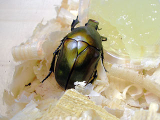最近、預かり中のグランディスとアウラタ♀のゼリーの好みがはっきり出てきました。現在、成虫が少ないウチの在庫は、ブリーダーズ・ファームの『濃厚タンパク・脂肪酸ゼリー 練』とカラーズの『乳酸パワーゼリー』とバリバリゼリーの3種です。ランダムに換えながらあげていたんですが、全く1つのゼリーだけをむさぼるように食べる感じに変わってきたんです今、食べているのが『濃厚タンパク・脂肪酸ゼリー 練』。東京キノコから『濃厚タンパクゼリー』として出されているものと同じです。あまり、食いがよくないという書き込みを読んだことがあるんですが、グランディスもアウラタもこれを入れたときの食いつき方が良過ぎです。グランディスは昼間に隠れもせずにかじりついてましたし、アウラタは夜通しゼリーにくっついていました。そういえば‥、この時のゼリーも同じゼリーでした(^-^;;;
