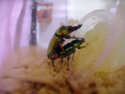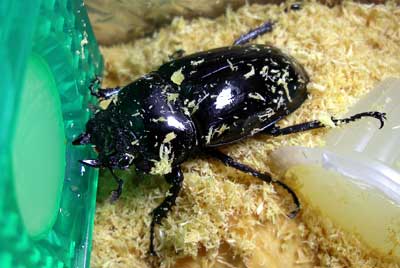 ここのところ、2つのプレ企画の協賛品発送と3つの当選もあって日記を書く時間が取れませんでした。なにしろプレ企画に協賛するのが初めてなだけでなく、ムシの発送そのものが初めてだったので、段ボール箱、容器、梱包などいちいちわからないことだらけ。さらにお送りする幼虫を厳選するために時間をとられてしまい、3日連続で3~4時に寝て6時に起きて出勤というパターンになっていました。きょうはカミさんがPTAイベントの準備で日中ずっと学校にいってしまうため、休みを取って長女(3歳)の子守でした。そこで、やっと午前中に3件9頭のプレ協賛品を発送!できました。夜の作業は、フジテレビで『24』3話連続放送を毎晩やってくれているので、全く眠くならず‥、ただテレビに釘付けになって作業が捗らなかったかも(^-^;;;発送の目処がついたところで、昨晩、今回大変にお世話になったFactory Breedingさんのオフ会にお誘いいただき、参加してきました独身時代はニフティの卓球・ボウリングフォーラムのオフ会で全国飛び回りましたが、クワカブでは初のオフ会。新鮮でした(^-^)そのオフ会で、予想していなかった出来事が。なんと、メタパパさんがプレ企画で当選させていただいた『タランドゥス♀』をオスとペアリング中の状態のまま持ってきて下さったのです。そして、もうペアリングは大丈夫、ということでお父さんタラにお別れのご挨拶をして、ピカピカした♀タラ子さんと一緒に帰宅することに(^-^;とうとう我が家にピカ虫がやってきましたしかも、いきなり産卵セットへの挑戦です!初心者の私に採れるはずがないと思っていますので、大胆に挑戦しビギナーズラックを狙います(^◇^;2つのプレ企画でエレファスの幼虫を9頭だして、当選がタラ♀、ヘラヘラ幼虫3、デレッセルツヤクワガタ幼虫4と全然減ってないですが、次は、かんろさんのHPの里親募集企画。かんろさんのHPも以前にチャットに参加させていただいていろいろ教えていただいたので、いつの日か協賛でお礼をと思っていたのです。今回は協賛だけで応募はしない予定なんですが‥‥‥。予定なんです(^-^;