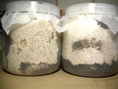 半月前によく見えなかった1400cc菌糸ボトル内のニジイロ幼虫。そろそろ蛹になってないかなぁ~、と思ってみたんですが‥、幼虫してました‥。ただ、こっちははっきりと見えるんですが‥、こっちが良く見えないんですわ‥(-_-;;;一つ気になっているのが、菌糸ボトルのフタ近くの菌糸のこと。フタの近くまでいっぱいになってるんですけど、この上のほうっていうのは、菌糸を常に剥いで空間を作っておいたほうがいいんでしょうか??少なくとも蛹化したら、いつ出てきてもいいように上のほうに空間があったほうがいいような気はするんですが‥‥‥。ところで、ニジイロチェックの前に、国産ノコギリクワガタの産卵セットの上に放置しておいた菌糸カスを細かくチェックしました。先日見つけた菌糸カス太郎を移動するためです。菌糸がかなり乾いてきてましたから。そしたら、また菌糸に潜っていた菌糸カス太郎を発見さらに、なんともう1頭発見(次郎?^-^;)。結局2頭が菌糸カスの中で生活していました。しかも、それなりに育ってる。。。ノコギリクワガタに菌糸は特にいい結果にならないと思っていたんですが、これってノコ♀が自ら菌糸の中に産みつけたんでしょうか? だとしたら、今後もこの2頭を菌糸で育ててもいいのかな? まさか転倒防止用に入れといたいらない菌糸カスから2頭も幼虫が出てくるとは‥、予想外です。シンジラレナ~イ。(←この2つ今年の流行語大賞にノミネートされるでしょうか^◇^;)