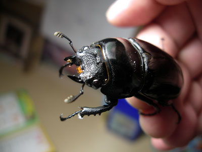 なかなか元気だったノコギリクワガタのメスが☆になりました。これでウチの国産成虫は、コクワガタのオス1匹のみです。室内の気温は20度を切ったりしていますが、コクワガタもほとんどゼリーは食べないものの夜中にウロウロしているようです。このコクワはきっと越冬をするのでしょう。ところで、この夏からカブト、クワガタと飼ってきて、死亡判定の基準が自分の中でできました。私は動かなくなっても、“=☆”とは考えません。触覚が格納されるまでは☆とは思えないんです。“触覚が格納される”というのは、頭部の裏側に見事に仕舞われるのです。触覚が出ているときは、全く動けなくても仰向けにしてじっと観察するとわずかに足を動かしたりすることが多いんです。ノコ♀も昨日動けなくなって、それでも今朝までは触覚が出たままでした。仰向けにして息を吹きかけたりして観察すると、ゆっくりわずかに足を動かしました。しかし、出かけて夜帰宅すると、触覚は格納されていました‥‥‥。もしかしたら触覚は死後硬直と共に格納されるのでしょうか。。。