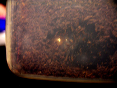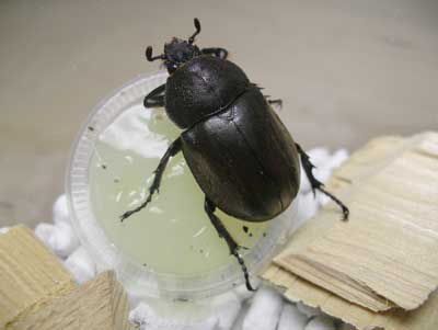 アウラタ♀、産卵セットに入れてから潜ったままで全くゼリーに口をつけていません。前回もそうでしたが、きっと産まないのに潜ったままなんです。産卵しないんだったら、ゼリー食べればいいのに‥、と思うんですけど、不思議な習性ですね。今産卵セットに使っているクワガタ用のマットの発酵が進みすぎているのかもしれません。そこで、今度マットを変えて産卵セットを組みなおすわけですが、今日も♀を確保すべく産卵セットを除いてみると、穴の中に隠れていく♀を発見。結局確保できなかったんですけど、前回もこんな状況だったのを思い出しました。産卵セットに入れて10日もすると、産卵場所を求めてさまよったあげく産卵する場所が見つからなかったのか、穴をあけて巣穴のようなところに入ってるんです。ただマットから出てきた穴って感じじゃないんですよね‥。それにしても10日も何も食べずに小さな体でよく平気なもんです。