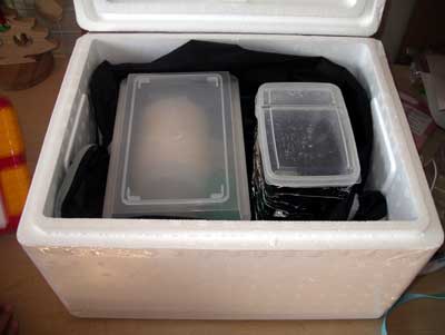 昨日、実家の近くのスーパーで発泡スチロールの箱を2つもらってきました!ちょうど小ケースが2つ並んで入る大きさの箱です。左側の小ケースにはタランドゥス♀と菌糸ビンが入っています。右側には固めたマットにアウラタ♀が潜っています。店で買おうと探すと意外と高い発泡スチロール。タダでいただけるんですから使ってみない手はありませんね(^-^)いただいた箱に元々入っていたのは『けんちんの具』(^◇^;魚でも野菜でもありませんでした。なかなか良さそうな箱です。家に持ち帰って、2ヶ所空気穴を開け、温度計のセンサーを穴から中に入れました。そして一晩、温度変化を箱の中と外でどれくらい違うか見てみました。まだ1日ですが、発泡スチロールに入れただけでは、温度変化は緩やかになるものの最終的には箱の中も外と同じ温度になるように思います。今現在は暖房もなく徐々に温度が下がっていっている時間帯ですが、こういう時間帯では箱の中のほうが約1度高くなっています。おそらく朝までには外と中が同じ温度になっていくんです。昨日の結果は最低温度も最高温度も中と外、一緒でした。実は、サーモスタットがまだ見つかっていないんです!近くのホームセンターのペットコーナーなんかで少しでも安く買おうとしてるんですけど、なかなかアドバイスをいただいた“サーモスタットの許容ワット(特に下限)に注意”の条件に合うサーモスタットって売ってないんですねぇ。(ネットではすぐ買えるんだけど‥)アドバイスをいただいてなかったら危うく100ワット~300ワットなんてとんでもないものを買ってしまっていたかもしれません(^◇^;;;そうそう、今日は渋谷のOASISに寄ってアウラタのマット産卵用にフォーテックの“MAXマットスーパー微粒子”を買ってみました。温度を23度に安定させて、このマットでアウラタの産卵セットを組みなおす予定です。発砲→発泡 誤字訂正しました(^◇^;;;12:25 画像掲載しました。
