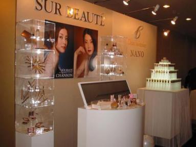 この画像は先日のイベントの展示会場です。シュールボーテシリーズが並べられてます。各地域のお店のディスプレイの参考にとのことでしょう。さすがにマネは出来ませんね。近づくように、頑張らなきゃ。 メイクのデモがありました。今期のポスターに登場のモデル嬢が登場。体が細いし、顔も小さいし…。他のモデルさんも、いろんなパターンメイクで登場。とにかく細い。小さい。しかし背は高いな。メイクの前に肉体改造?