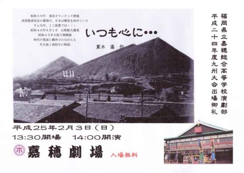 お客様のaさん。お仕事は高校の先生。そして演劇部の顧問も。 2月3日(日)13時30分開場 14時開演。平成24年度の九州大会出場記念公演ですって! それも嘉穂劇場で。 無料なんで、まだ嘉穂劇場に行ってない方は是非!