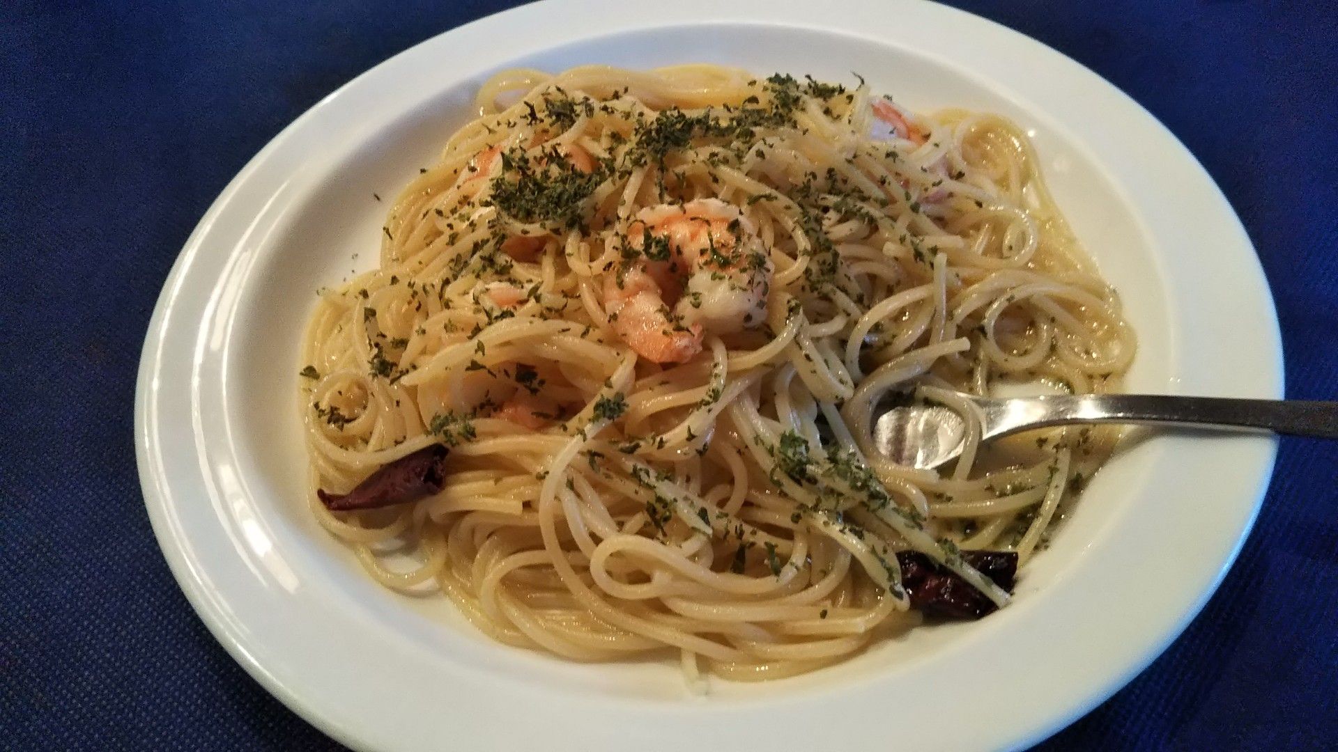 今日も バカは ブタの エサやり 一人でディナー 懐花停の エビスパゲッティ ちょっい 大人向き ちょっい ヒリヒリ でも エビ 最高 美味しかった 😃✨