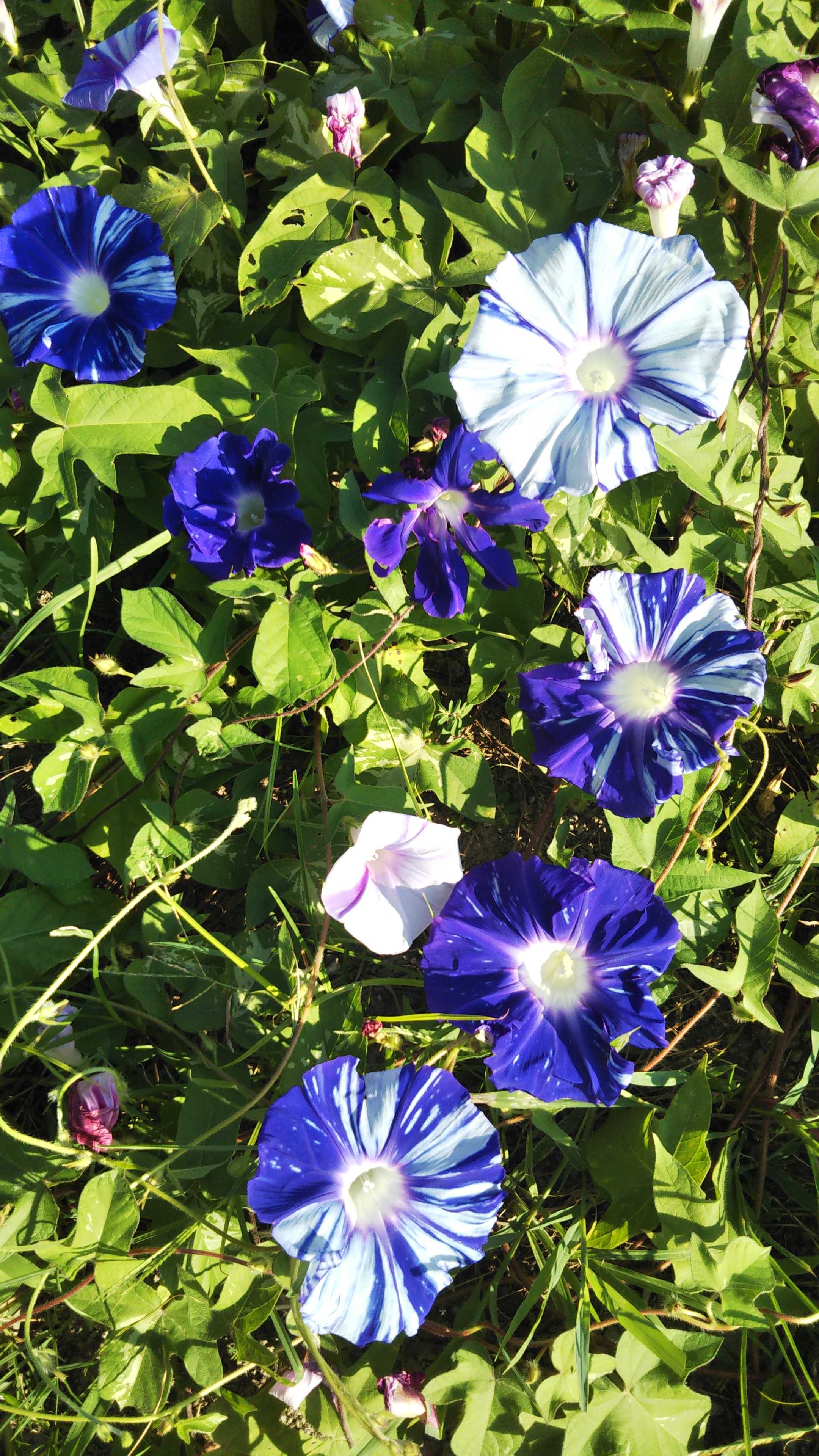 内田さんの 自転車 ない 調子 悪いの😭⤵️⤵️ 昭和町回り 公園に 帰ったら ○○さんと 会い アサガオの花が キレイと 写真? スマホ 忘れたと (笑) ラジオ体操の帰り 教えて貰った所で パチリ 青色ピンク