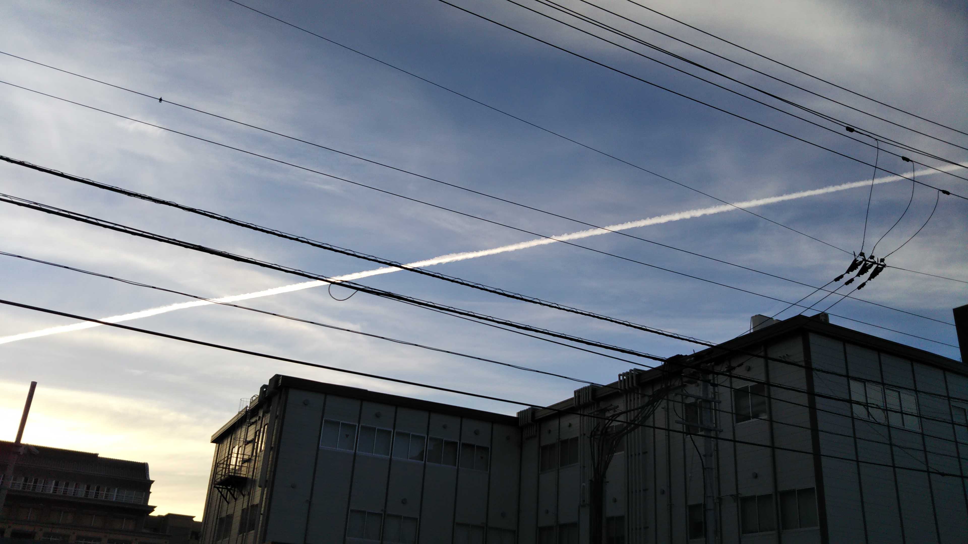 今朝も スッキリ 目覚め スイスイ 中央公園で 内田さんと会い 堀端 歩いてたら 東の空 飛行機雲 何時もより はっきり 太く 見える