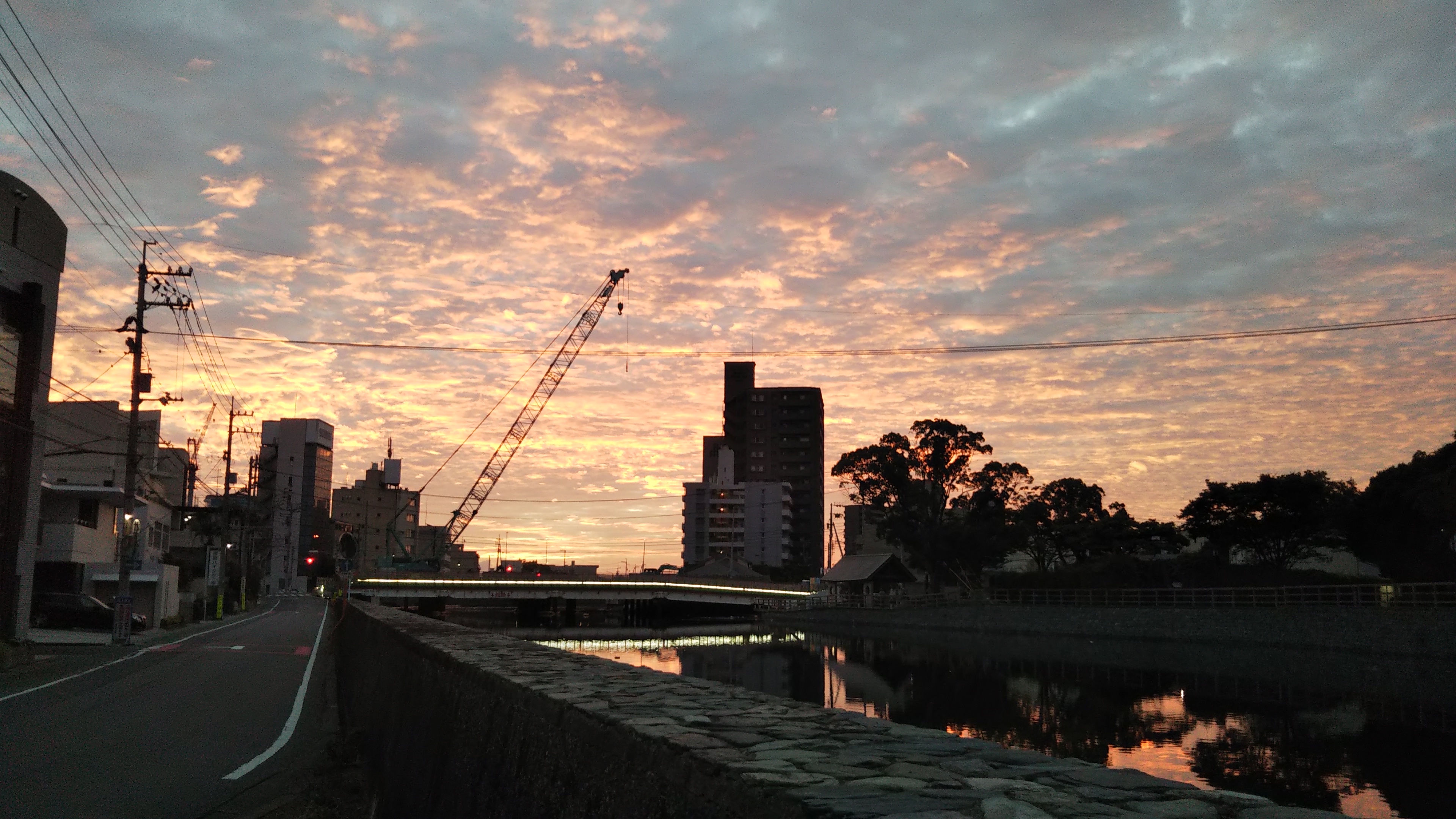 5時前に目覚め 起きて 何時もより チャチャと 顔 洗い 昭和町目指してテクテク県庁の横の橋からの日の出 ちょい まだ 暗いりおのばあば1番 13684歩