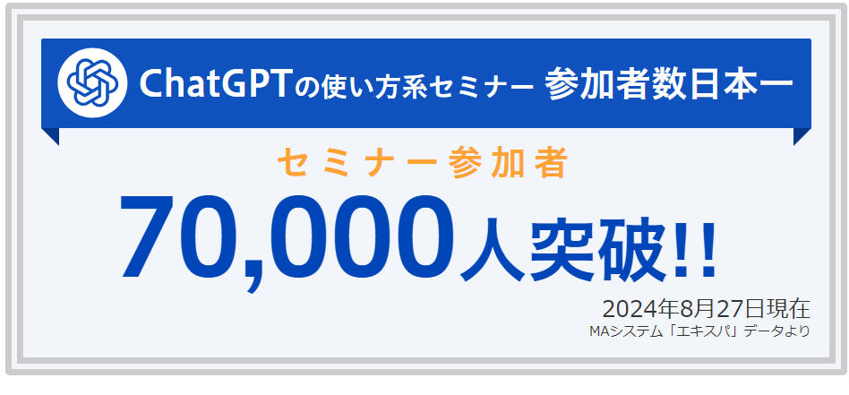 すでに 70,000人 が「 ChatGPT徹底解説セミナー 」に参加して、AIを使いこなしているんです。