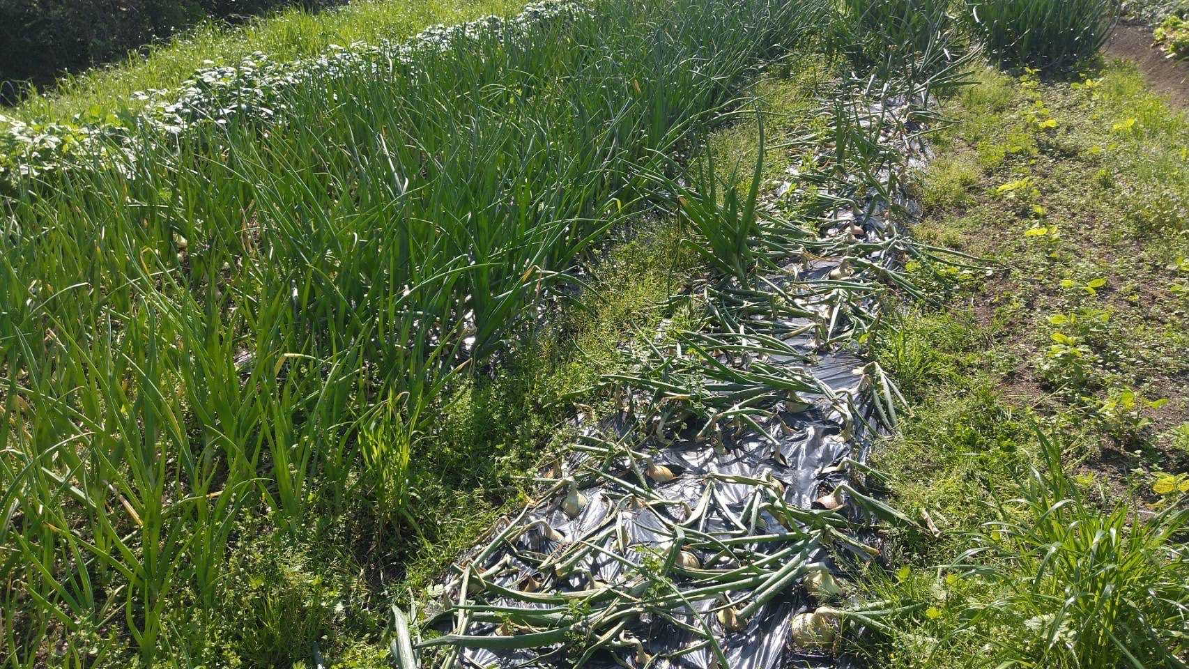 タマネギは乾燥させないと腐るので、雨の日の収穫はNGです。しかし、大きく育ったタマネギを放置すると、それはそれでNGです。どうしよう…。