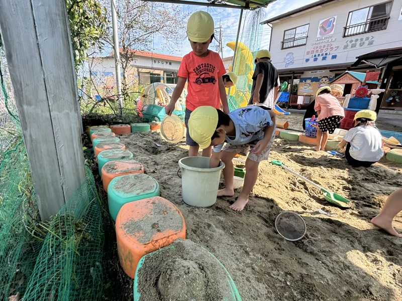 水を使って砂の感触の変化を楽しんだり、バケツで水を運んで工夫しながら遊ぶ姿も見られ、子どもたちの探求心や創造力が豊かに発揮されていました。