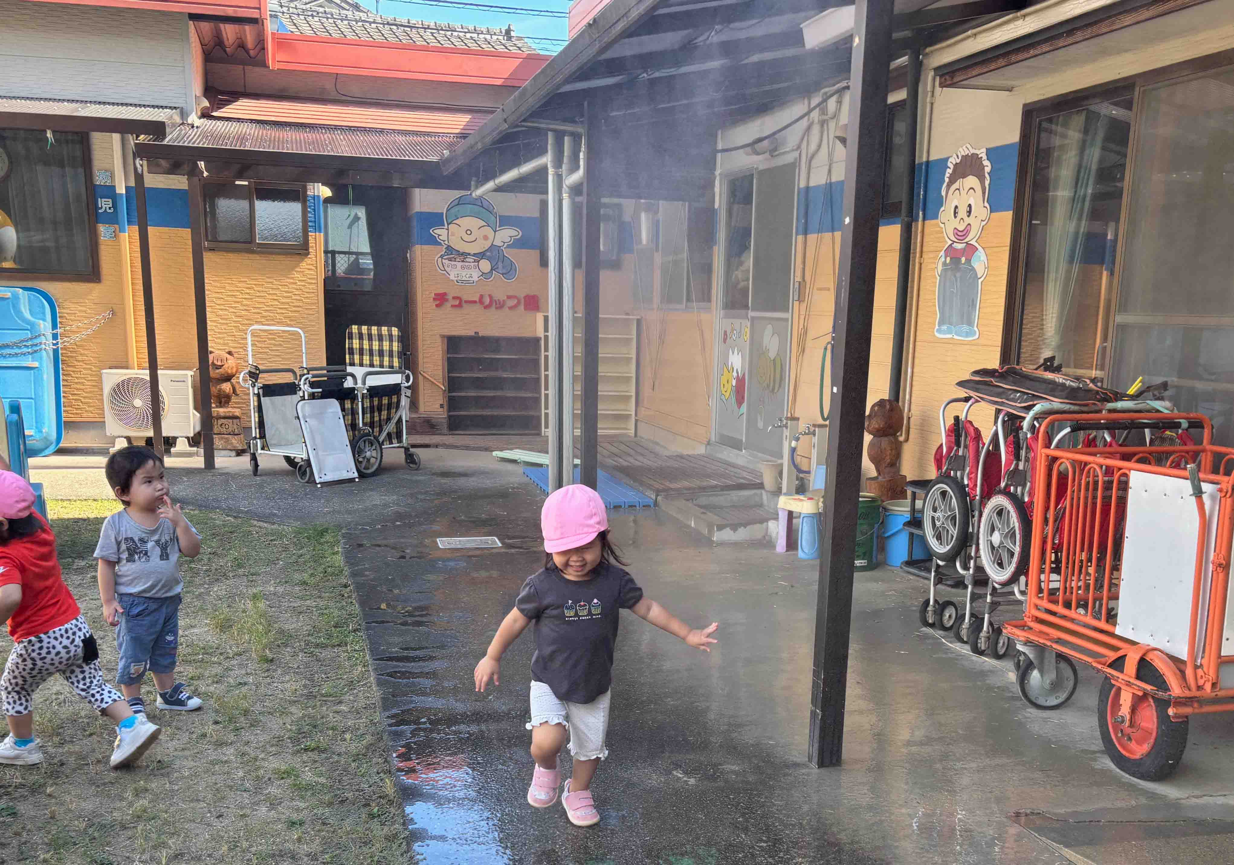 夏の暑さが続く中、子どもたちは園庭のミストを浴びて元気に走り回っています。プール遊びは終わりましたが、水を使った遊びを工夫して、暑さ対策をしながら保育を続けています。冷たい水しぶきを浴びて楽しむ姿は、見ているこちらも涼しい気持ちになりますね。これからも、子どもたちが安全に楽しく過ごせるように取り組んでいきます。