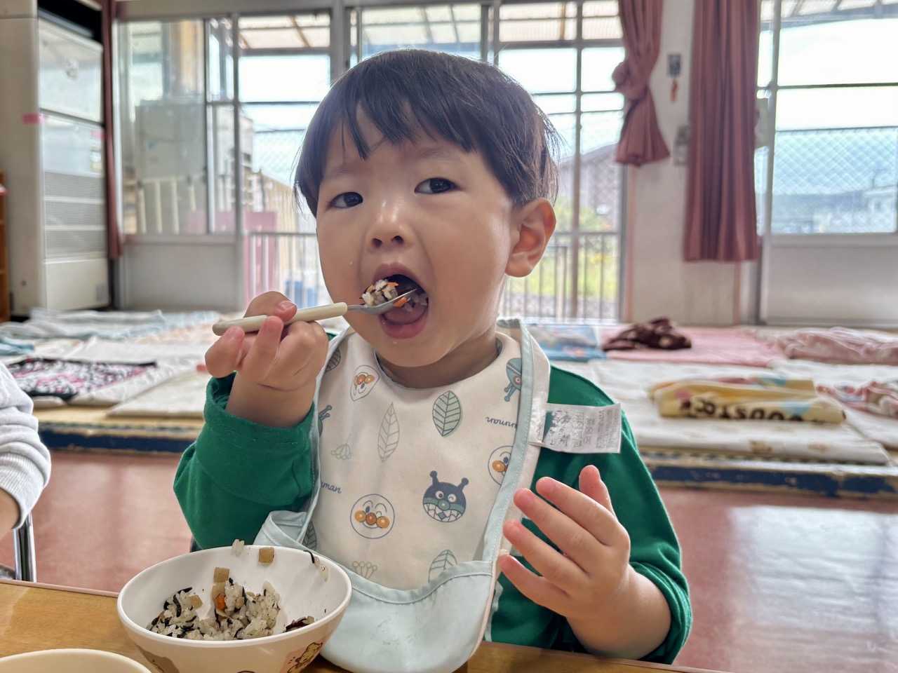 今日は、給食の時間です。お椀に盛られたご飯を、大きな口で「あーん」と頬張っています。スプーンをしっかり握って、一生懸命自分で食べる姿は本当に可愛らしいです。もぐもぐとしっかり噛んでいる様子が伺えます。自分で食べることで、食事への興味や意欲がぐんと高まります。また、「全部食べられたよ!」という達成感は、子どもたちの自信にも繋がります。周りのお友達も、おいしそうに食べる男児の姿を見て、ご飯がもっと好きになってくれたら嬉しいです。毎日、栄養満点のご飯をしっかり食べて、元気いっぱいに過ごしましょう。