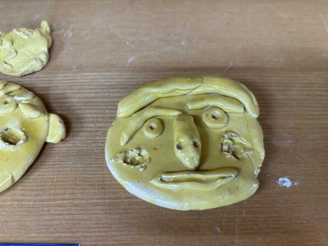 陶芸作品のご紹介です。 今回は4歳児クラスのお子さんが作った作品です。粘土を丸く平らにして、顔に見立てていますね。太い眉毛や、くりっとした目、鼻や口の表現に、その子の個性や力強さが感じられます。特に粘土を盛り付けて作った髪の毛の表現がユニークです。毎月の作品作りは、いつも楽しみにしている様子がうかがえます。粘土の感触や形を変える面白さを存分に味わいながら、集中して取り組んでいました。作品から伝わる豊かな創造力と、一生懸命作ったお子さんの姿を想像すると、私たちも嬉しくなります。ご家庭でもぜひ作品の感想を聞いてあげてくださいね。