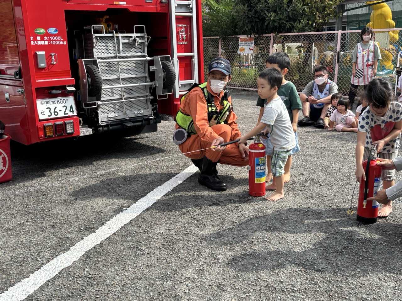 先日、保育園に消防署から消防士さんが来園され、消防訓練を行いました。今回は、水消火器を使った模擬消火体験があり、子どもたちは真剣な表情で挑戦していました。かっこいい消防士さんに教えてもらいながら、小さな体で一生懸命にレバーを握り放水する姿は、とても頼もしかったです。訓練後には、真っ赤な消防車の見学もさせていただきました。間近で見る迫力満点の車体に、子どもたちは目を輝かせ大喜びでした。火の怖さを知り、もしもの時の行動を学ぶ、貴重な一日となりました。これからも、命を守るための訓練を大切にしていきます。