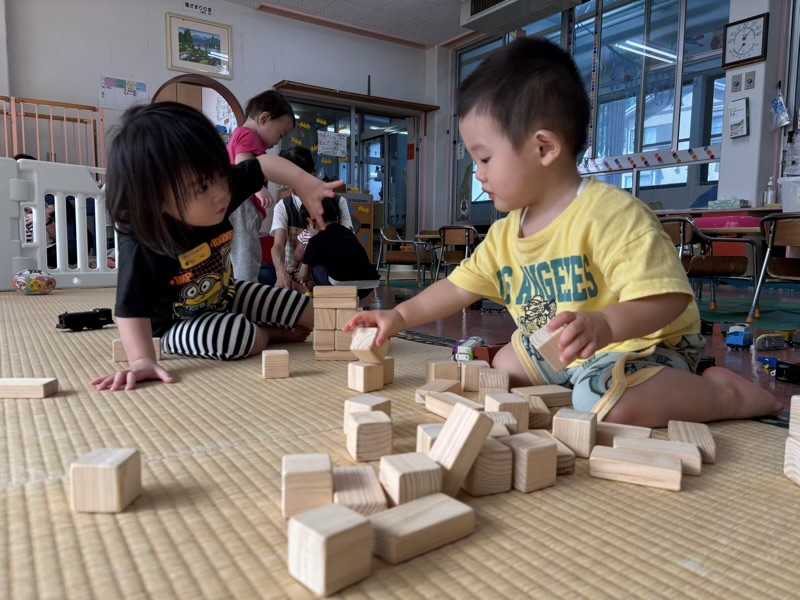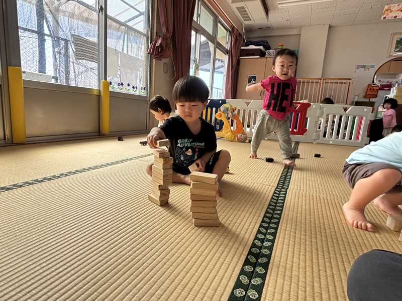 保育園での積み木遊びの様子です。1歳児のお友だちは、積み木を目の前にすると自然と高く積み上げ始めました。崩れるたびに「あー!!」と残念そうな声。それでもめげずに再挑戦し、うまく積み上がると嬉しそうに手を叩いて大喜び!その可愛らしい姿に、見ているこちらも思わず笑顔になりました。遊びを通して集中力や達成感を育んでいます。