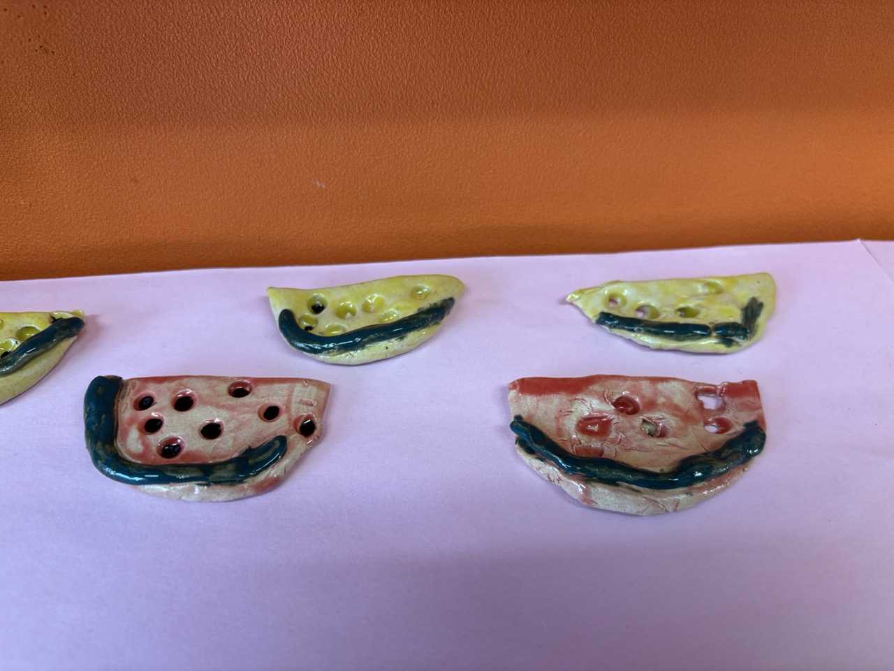 2歳児クラスのみんなが作った陶芸作品、「スイカ」が無事に焼きあがりました。窯から出てきた、かわいらしい作品を紹介します。粘土をこね、形を作るという初めての作業から、みんなとても集中して取り組みました。釘の反対側を使って種に見立てた穴を開けたり、色付けをしたりと、一つ一つの工程を楽しみながら仕上げました。道具を上手に使う姿に成長を感じます。焼きあがったスイカは、赤や黄色など、子どもたちの個性と創造力が光る、愛らしい仕上がりになりました。