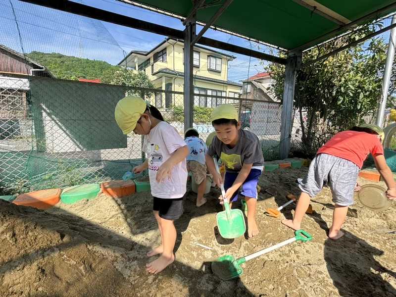 今日は5歳児さんが砂場で遊びました。砂場では、お友達と協力して大きな山を作ったり、長いスコップを使って深いトンネルを掘ったりと、ダイナミックな遊びが展開されていました。水を使って砂の感触の変化を楽しんだり、バケツで水を運んで工夫しながら遊ぶ姿も見られ、子どもたちの探求心や創造力が豊かに発揮されていました。思い切り体を動かし、手先も使って遊ぶ中で、満足感に満ちた笑顔がたくさん見られました。今後も天気の良い日には、戸外での遊びを大切にし、子どもたちの探調心や協調性を育んでいきたいと思います。