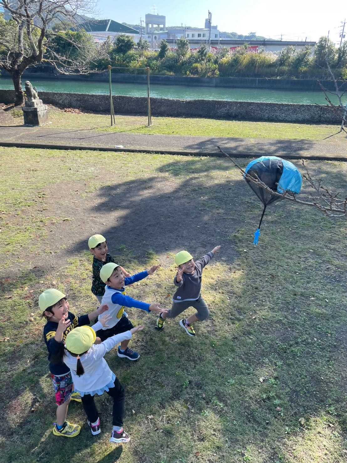 先日みんなで、近くの神社へお散歩に出かけました。大きな木々が並ぶ境内で遊んでいると、上空からフワフワと舞い降りてくるパラシューターを先生がポーンと投げてくれました。子どもたちは「わー!」と歓声を上げ、一斉にキャッチしようと駆け出します。緑の帽子を揺らしながら、誰よりも早くパラシューターに触れようと必死です。「私にちょうだい!」「僕が捕まえる!」と、みんな目を輝かせて手を伸ばしています。青空の下、神社といういつもと違う場所での「パラシューター追いかけっこ」は、最高の盛り上がりを見せてくれました。見事、空からのお客さんをキャッチできたのは誰かな?