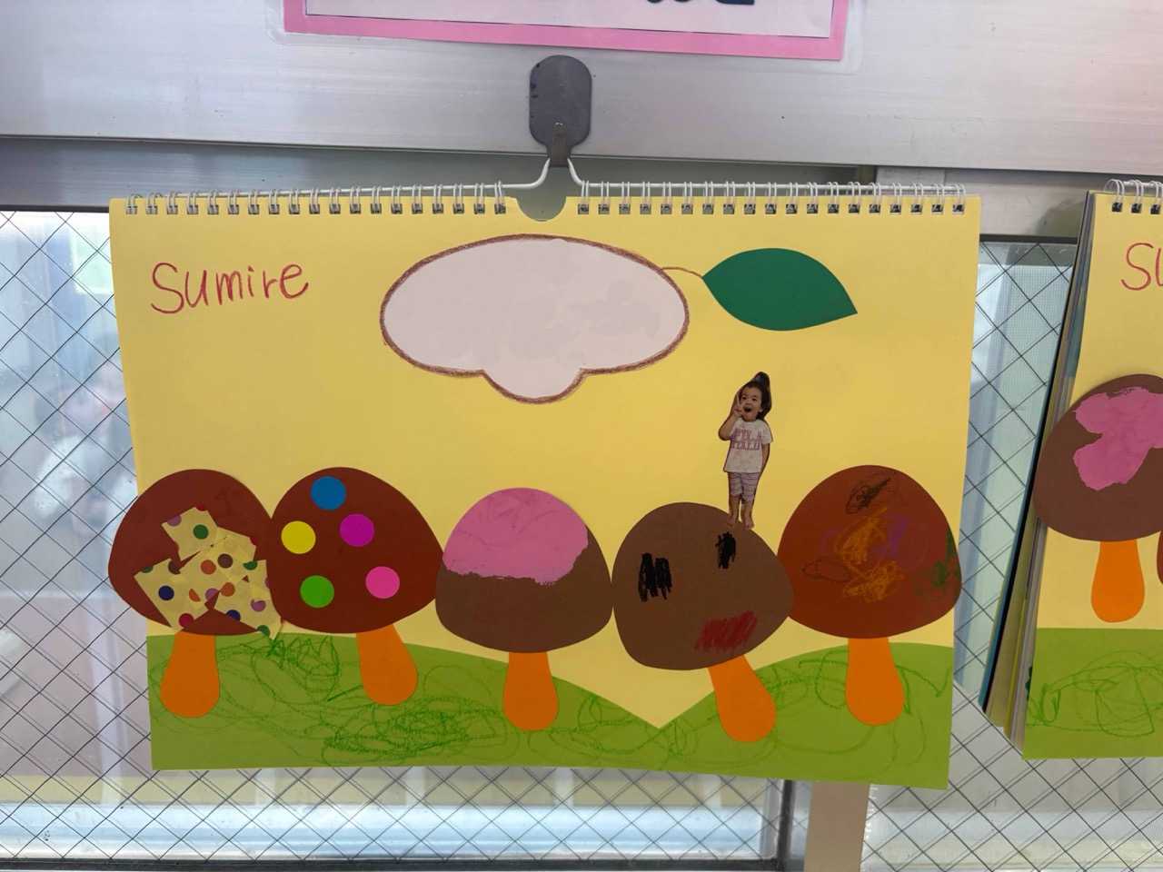 みんなが大好きな、あのチョコレートのパッケージをモチーフにした作品です。茶色の画用紙を丸く切って、思い思いの色をつけたり、シールを貼ったりして、カラフルなきのこができあがりました。真ん中の子どもの絵もかわいらしく、今にも「きのこ」と元気に言い出しそうですね。世界にひとつだけの、個性豊かなきのこの作品。どれもとっても愛らしいですね。