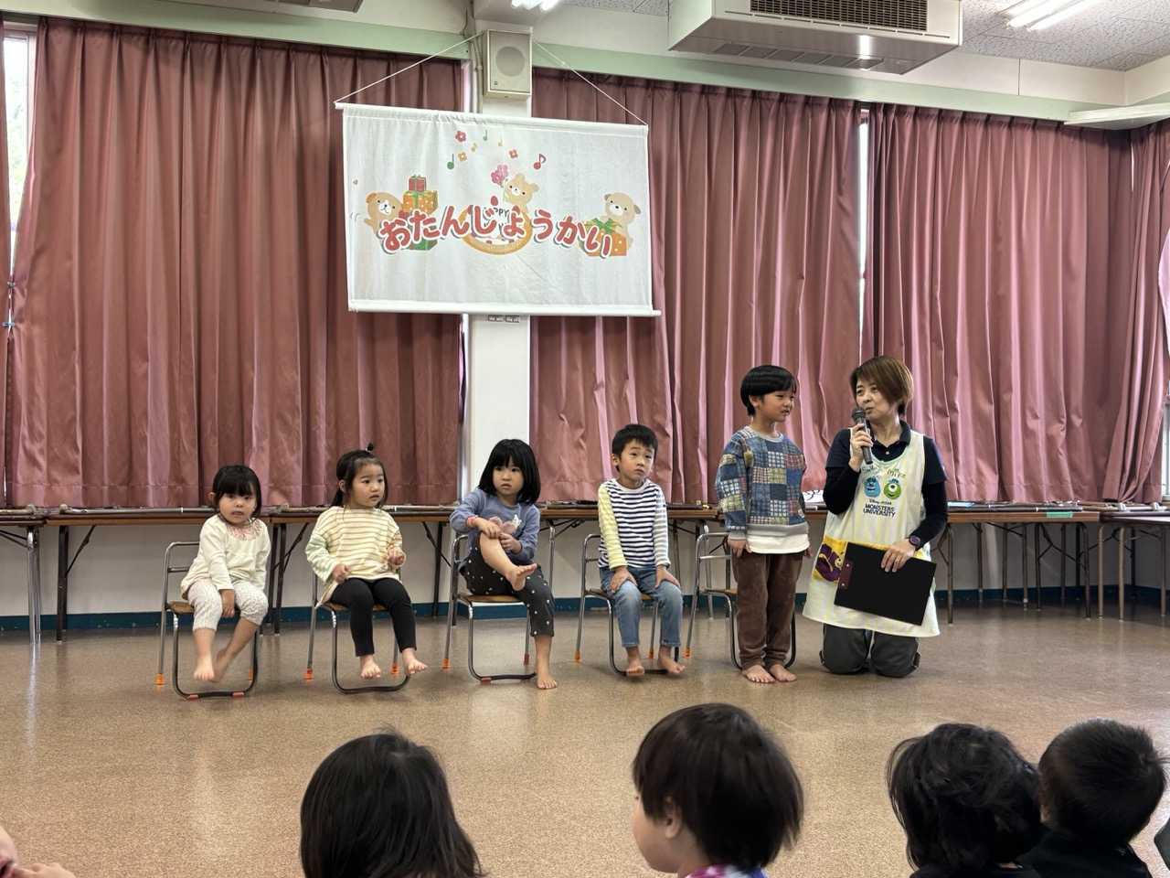 本日、5名のお友達がお誕生日を迎えました。みんなの前に立ち、少し緊張しながらも、一人ひとりしっかりと名前や好きなものを発表する姿は、とても立派でした。先生からの楽しい出し物や、みんなで歌う「ハッピーバースデー」の歌で、会場はお祝いムードに包まれました。この一年が、子どもたちにとって笑顔あふれる素敵な日々となりますように。これからも健やかな成長を心からお祈りしています。お誕生日おめでとうございます!