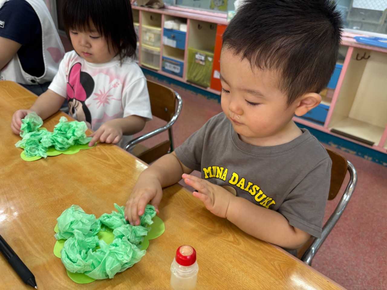 新しい作品作りの時間です。みんな真剣な表情で、緑色の紙をくしゃくしゃと丸めています。まるで、緑のブロッコリーや木、またはかわいい怪獣にでも変身しそうです。どんなものができるか想像を膨らませながら、小さな手で一生懸命に作業する子どもたち。完成が楽しみですね。子どもたちの豊かな発想力に驚かされます。何になるのか、完成したらお知らせします。