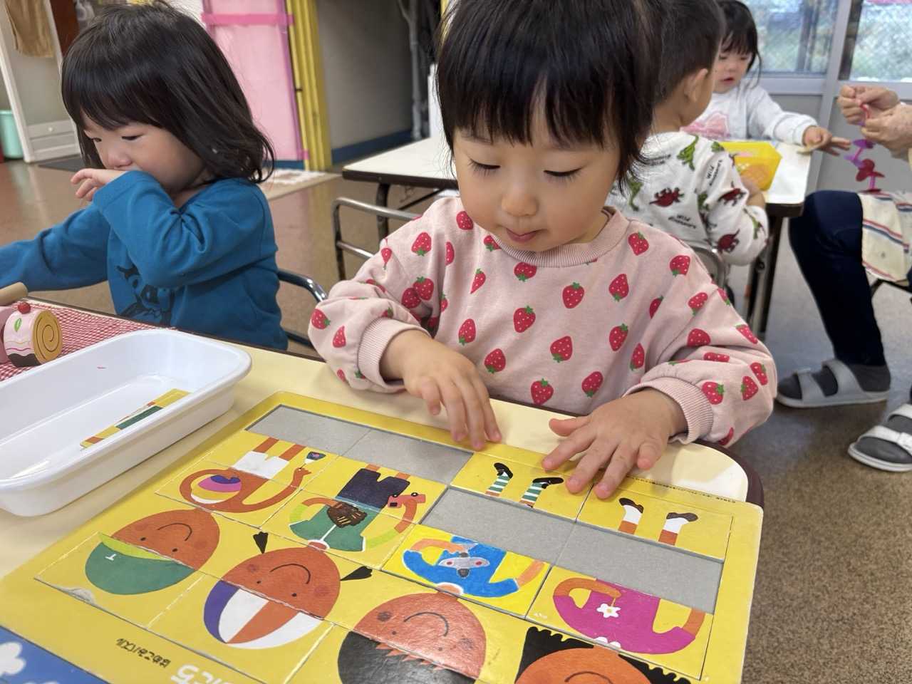 パズルの様子です。最初はピースの多さに戸惑っていた子も、お友達や先生と一緒に取り組むうちに、少しずつ集中力と観察力を発揮し始めました。できた時の「やったー!」という達成感あふれる笑顔は、見ているこちらも嬉しくなります。難しいパズルに挑戦する子、得意なパズルを何度も繰り返す子、みんなそれぞれのペースで夢中になっています。