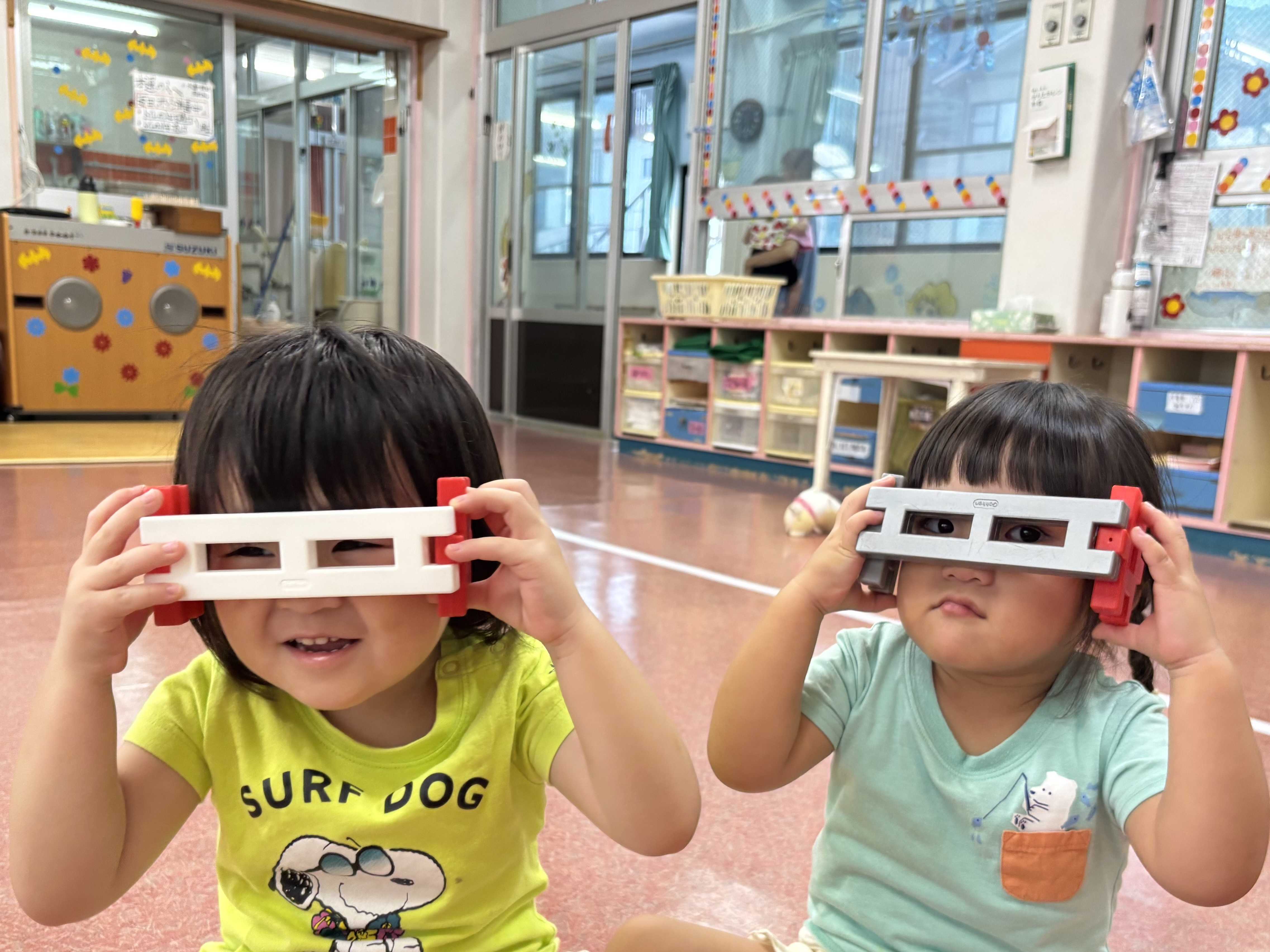 今日は、ブロックで遊びました。子供たちは、自分たちで工夫しながらブロックをいろいろな形に作っています。そんな中、「先生メガネ」と言って作っているのを見せてくれました。とてもかわいかったので、1枚撮らせていただきました。また面白いのができたら紹介したいと思います。