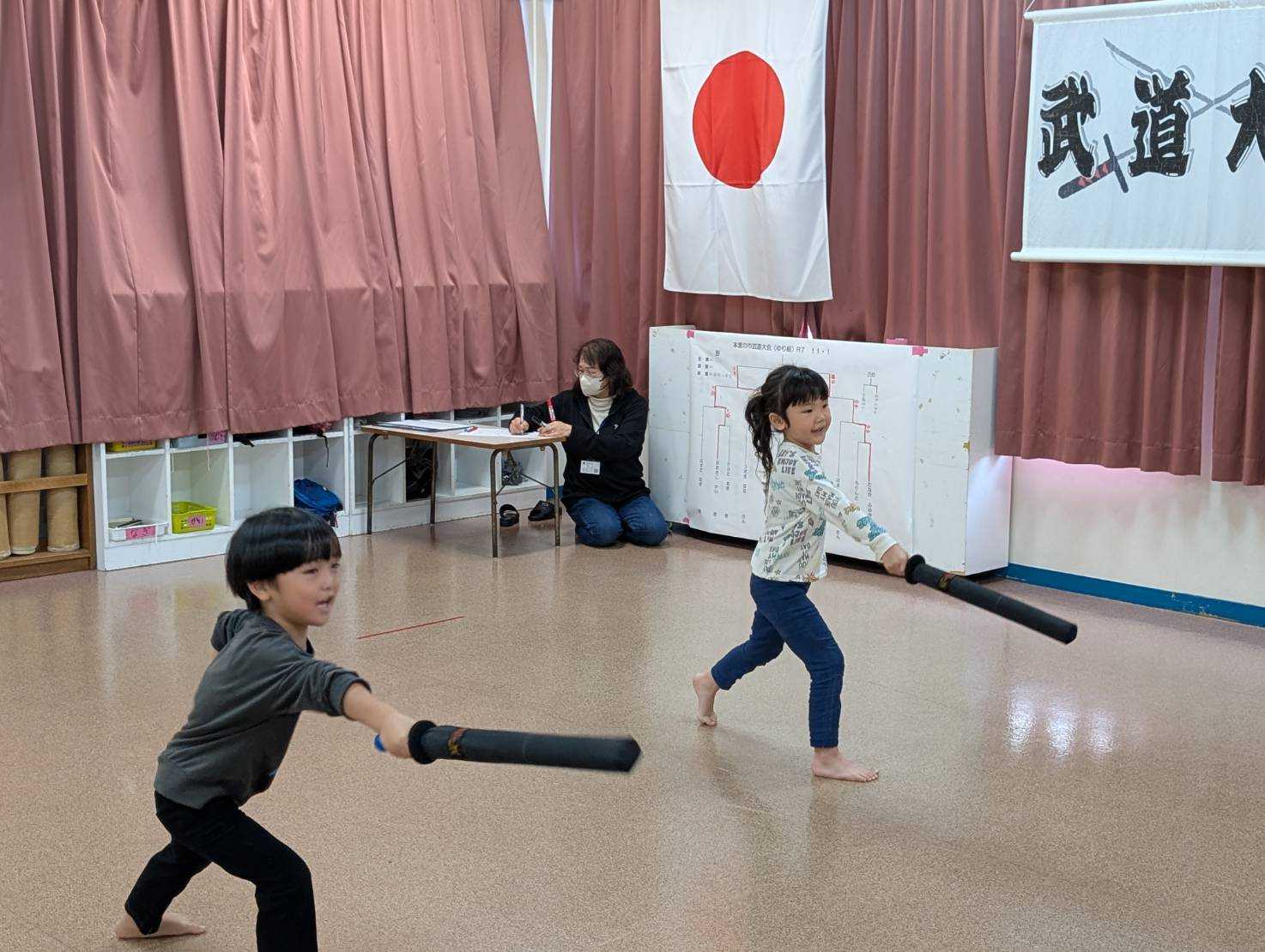 年長さんによる「形の試合」が行われました。子どもたちは、日頃の稽古の成果を発揮すべく、一人ひとりが気合に満ちた素晴らしい形(かた)を披露してくれました。刀を力強く握り、真剣な表情で相手と向き合う姿は、まさに小さな武道家。その一つ一つの動き、そして会場に響き渡る大きな気合の声が、見守る保護者の方々や先生たちの胸を打ち、会場全体を熱い感動で包み込みました。勝敗を超え、最後まで集中してやり遂げた年長さんたちに、心から拍手を送ります。