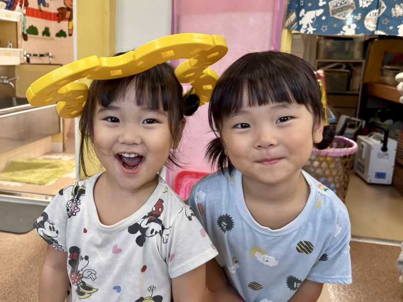 左の女の子がブロックで作ったユニークな冠をかぶっていると、お姉ちゃんが駆けつけてくれました。二人とも、とても嬉しそうな表情ですね。自分たちで作った遊び道具や、楽しそうな様子が伝わってきます。この日の思い出が、この写真と共にいつまでも残りますように。