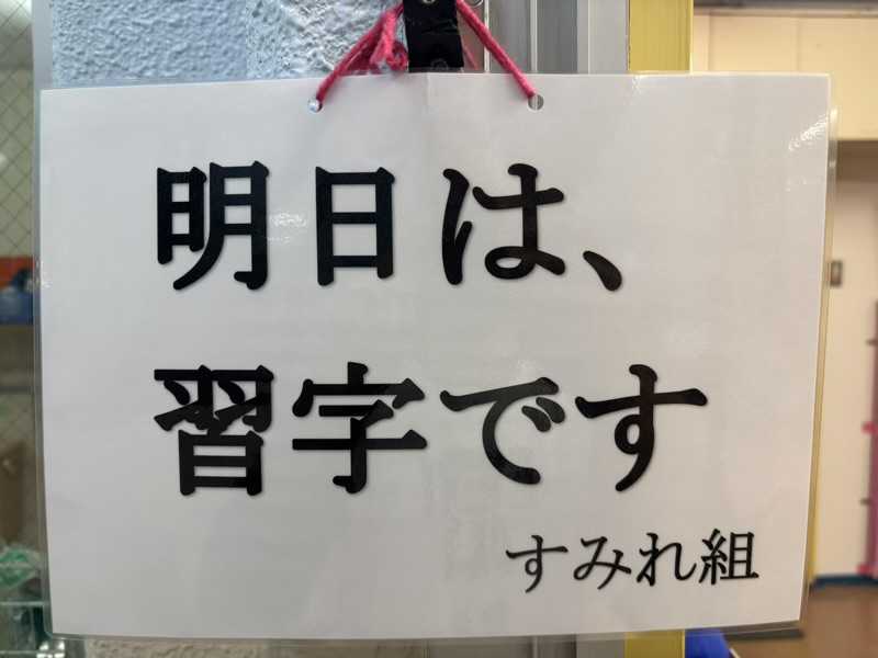 「明日は、習字です」の張り紙の通り、明日からすみれ組(2歳児)で習字が始まります。筆の持ち方から、墨をつけすぎないよう「墨の切り方」まで、初めての道具に触れる一つ一つの動作を、私たち保育者が丁寧に伝えながら、活動を進めています。集中して真剣な表情で筆を握る姿は、とても愛おしいです。紙いっぱいに描かれた墨の線は、子どもたちの個性があふれる立派な作品です。今後も、書くことを楽しみながら、表現力や集中力を育めるよう見守っていきます。