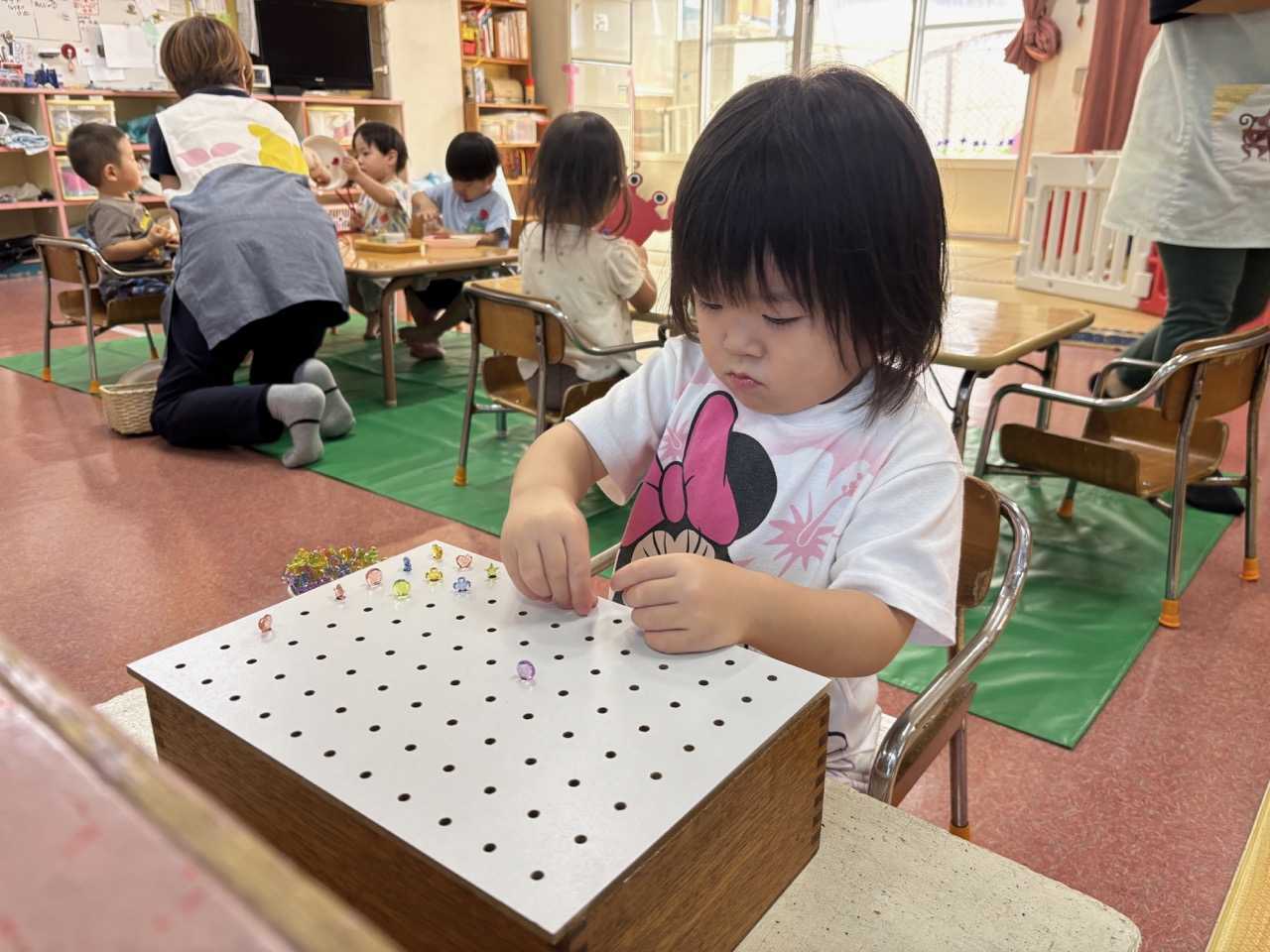 今日は「知恵の棒」の教具に夢中です。小さな穴に棒を一本ずつ差し込む、指先の集中力が試される活動です。真剣な表情で黙々と取り組む姿は、まさに「全集中」。初めは難しそうでしたが、少しずつできるようになり、最後までやり遂げていました。遊びを通して、集中力や達成感を育む大切な時間になっています。