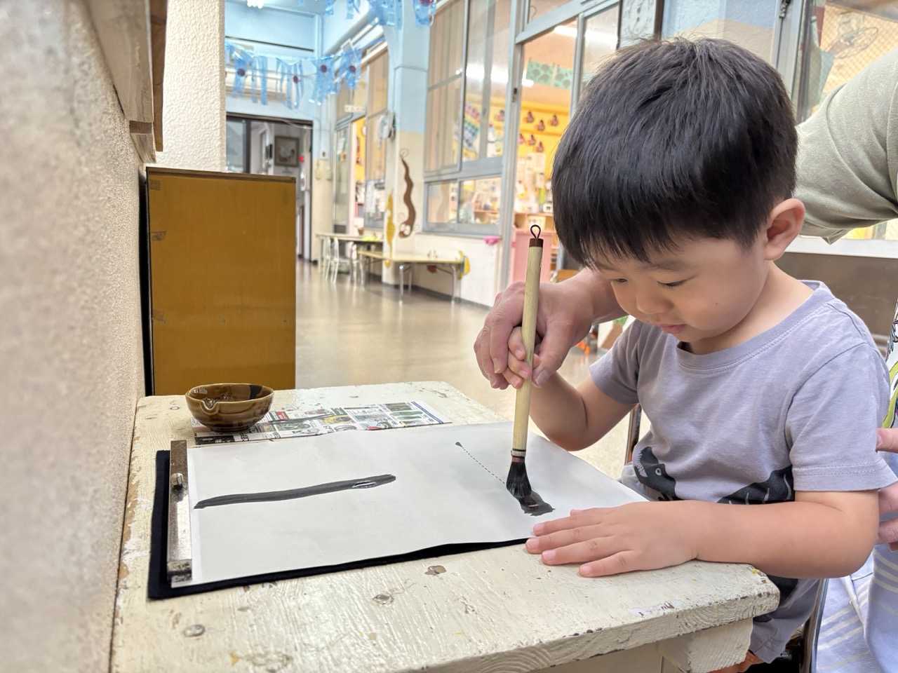 今日は、みんなにとって初めての「習字」の時間がありました。少し緊張した面持ちでしたが、筆を持つ手は真剣そのもの!最初は墨の感触や、筆をどう動かすのか戸惑う姿も見られましたが、保育士が手を添えて一緒に筆を運ぶと、「わあ、できた!」と目を輝かせていました。